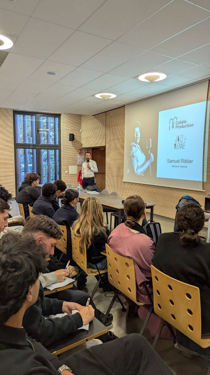Au cours de son intervention, Samuel Riblier a présenté Cybèle Productions, l’entreprise publique qui gère le festival. Il a détaillé le fonctionnement de cette structure, les enjeux économiques, culturels et territoriaux liés à l’organisation d’un événement d’envergure internationale, ainsi que les défis du management d’équipes, du financement et de la communication dans un contexte culturel.