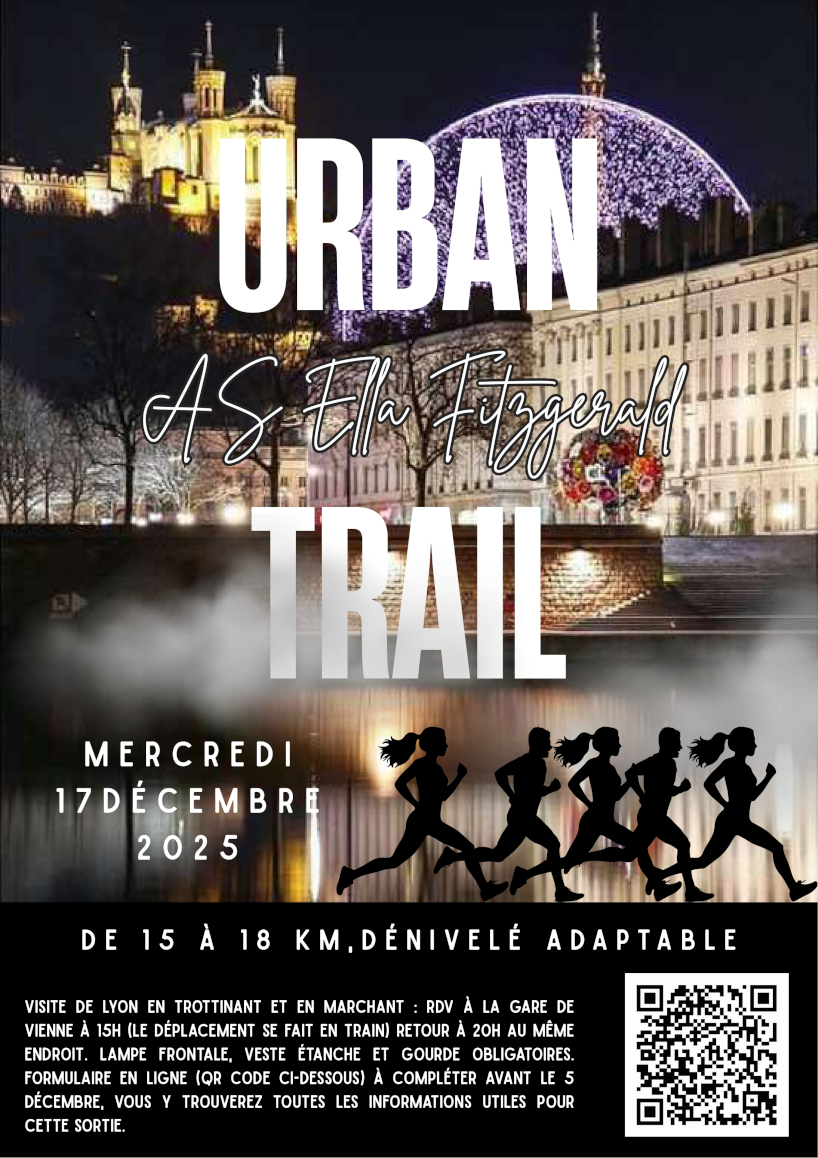 Visite de lyon en trottinant et en marchant : rdv à la gare de vienne à 15h (le déplacement se fait en train) retour à 20h au même endroit. Lampe frontale, veste étanche et gourde obligatoires. Formulaire en ligne (QR code ci-dessous) à compléter avant le 5 décembre, vous y trouverez toutes les informations utiles pour cette sortie.